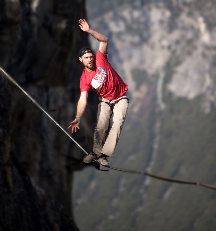 The idea of walking a tightrope is simple — I’m going to walk from this cliff top to that cliff top on this magnificently tiny bridge.