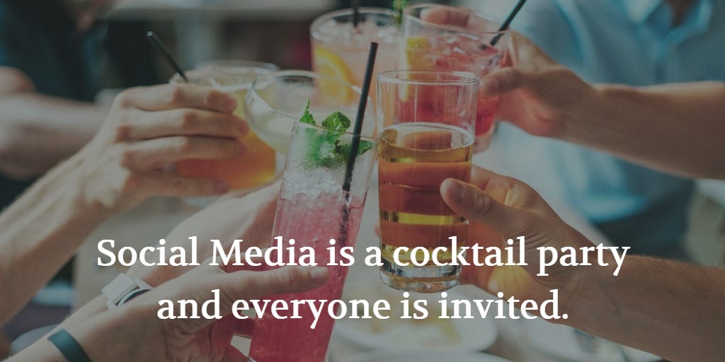 Back in the early days of "enterprise 2.0" (anyone remember that?), my favorite analogy was that all the socials are one giant cocktail party and everyone is invited.